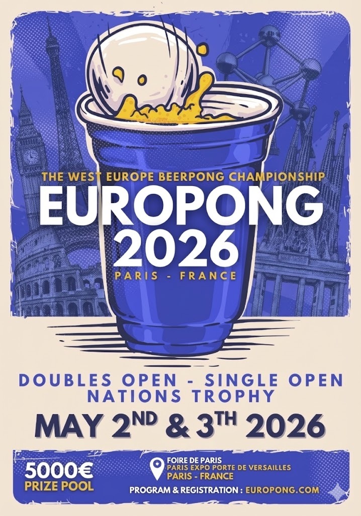 Europong 2026 is the premier Beerpong championship uniting players from across West Europe. Join us in Paris, France, on May 2nd and 3th for an unforgettable experience !